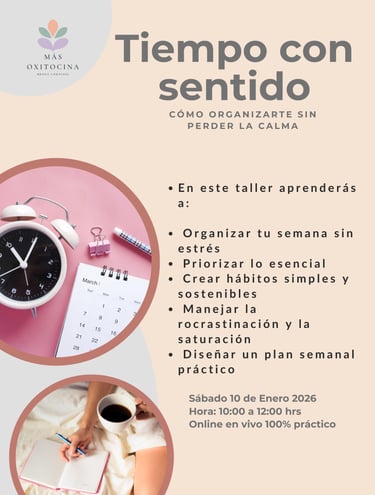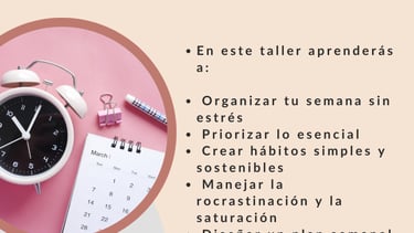 Este no es un taller más de agenda y horarios. Es un espacio para detenerte, mirar tu vida con honestidad y aprender a usar tu tiempo como una herramienta de bienestar, propósito y equilibrio emocional.